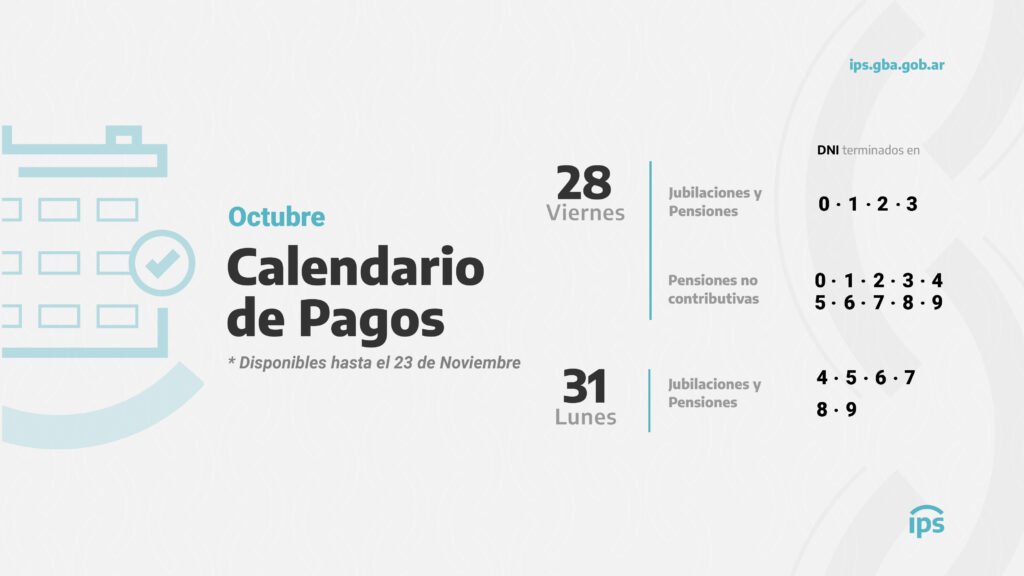 El Instituto de Previsión Social (IPS) informa que las personas jubiladas y pensionadas de la provincia de Buenos Aires percibirán los haberes del mes de octubre los días viernes 28 y lunes 31 del corriente, según cronograma que se detalla a continuación: