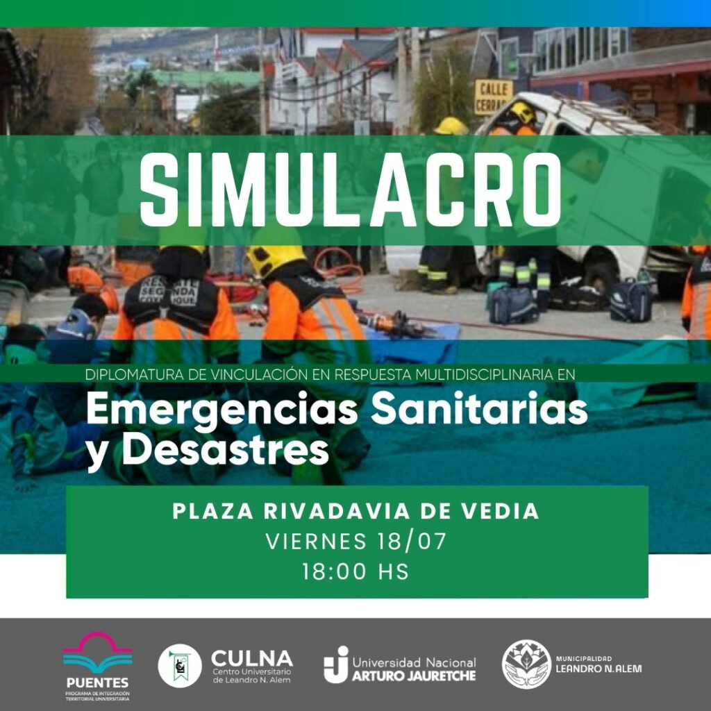 El viernes 18 de julio a las 18hs. se realizará un simulacro de campo como cierre de la Diplomatura de Respuesta Multitudinaria en Emergencias Sanitarias y Desastres dictada en el Centro Universitario de Leandro N. Alem por la Universidad Nacional Arturo Jauretche y el Plan Puentes de la Provincia de Buenos Aires.
