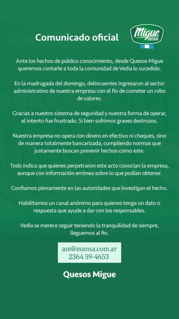 Quesos Migue remarcó que Vedia merece seguir teniendo la tranquilidad de siempre y pidió la colaboración de la comunidad para llegar al esclarecimiento total del caso.