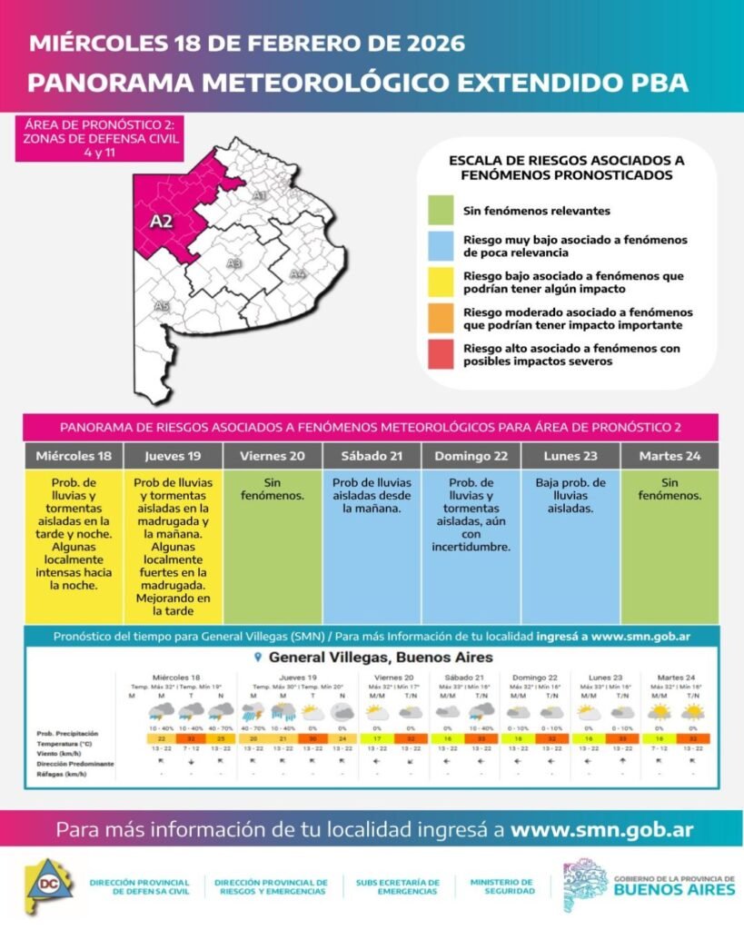 El jueves comenzará con condiciones inestables en gran parte de la provincia, con probabilidad de chaparrones y tormentas, especialmente durante la madrugada y principalmente sobre la franja norte. Posteriormente, las condiciones tenderán a mejorar de sur a norte a lo largo del día.