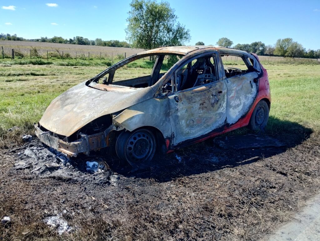 Un automóvil se incendió por completo durante la madrugada sobre la Ruta Nacional N.º 7, a la altura del kilómetro 315, frente al campo de Walter Arceluz.