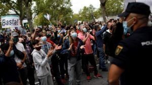 Una de las protestas por las medidas de aislamiento en Madrid. La Real Academia Española (RAE) aprobó el uso del vocablo «covidiota» para