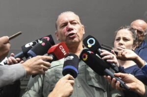 El ministro Sergio Berni tras la agresión. (Télam) El ministro de Seguridad, Sergio Berni, habló con los medios televisivos al salir del hospital Churruca, tras